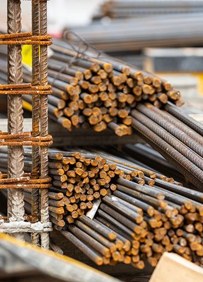 Steel bars and secondary reinforcement for columns, beams, slabs, and foundations.